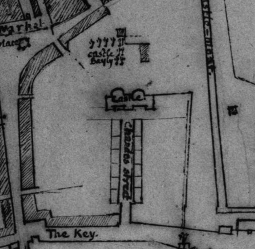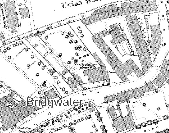The 1735 Stratchey Plan of Bridgwater (north is on the right) showing ‘Castle Bayly’. Neither of the houses later called Castle Bailey are shown here, but the map is a very rough sketch and omits many known features.