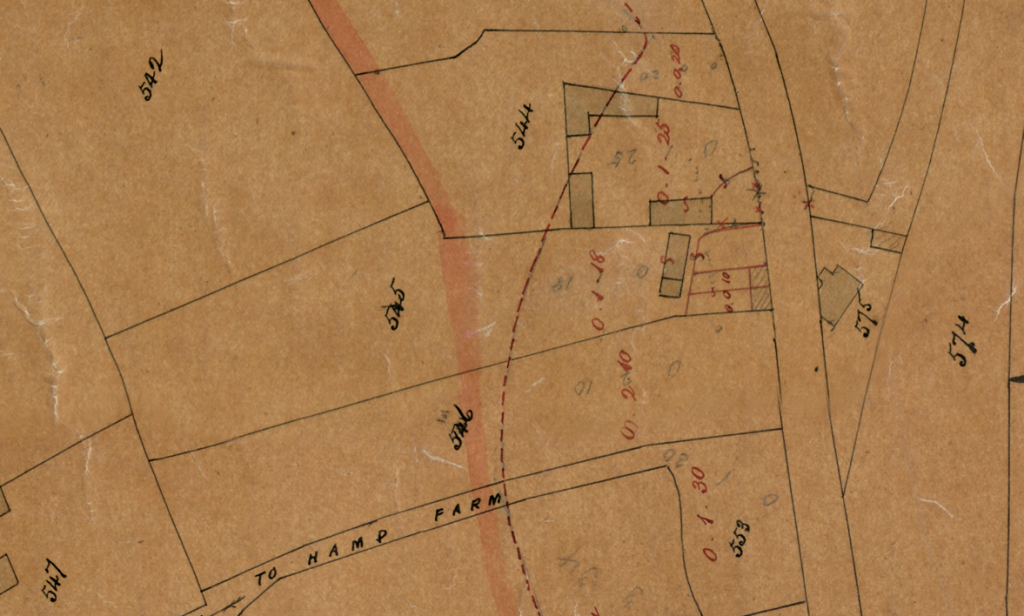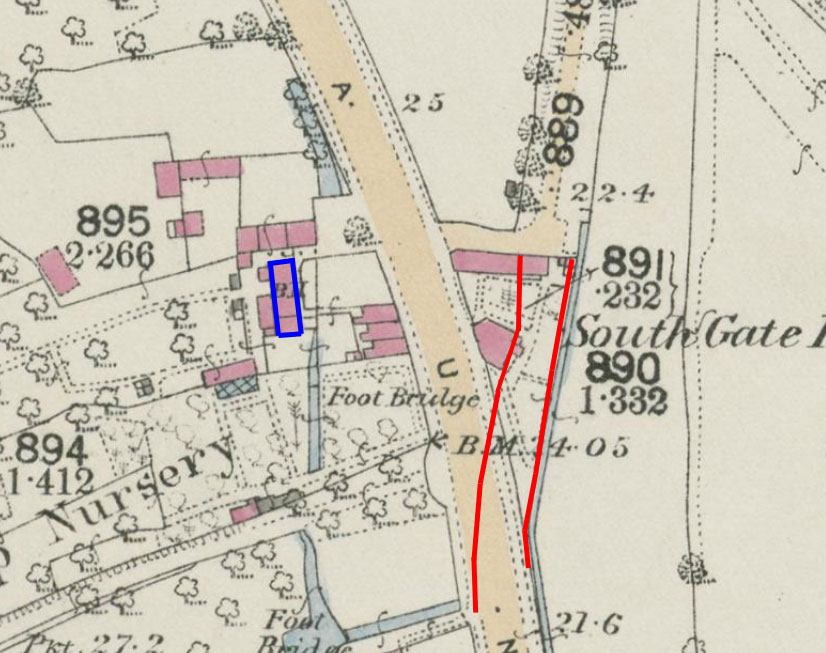 The Hope Inn building marked in blue, with the old course of Taunton Road in Red. See how the old building ran more parallel with the old road, but not with the new. Overlaid on the 1887 25″ Ordinance Survey Map.