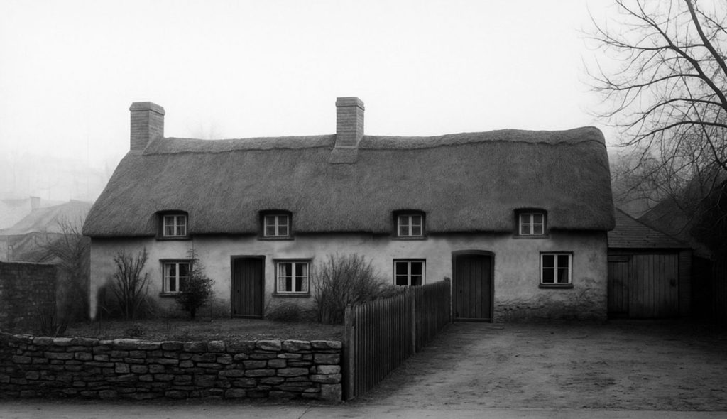 This picture tells us there’s some severe structural problems with the old building at this time. On the left hand side three timber struts have been placed to hold the walls up. There is unfortunate bowing along the line of the roof. This will be because the underlying timber ridge and supporting rafters have become misshapen. The four peculiar ‘cat slide’ dormer windows – very unusual features on a building so small – will explain the structural issue here. No builder would intentionally build something so complicated on a new building like this, so what has clearly happened is that this building should have a thatch roof, not tiles. At some point the thatch has been replaced by clay tiles, and presumably the weight of these has caused the supporting timbers to struggle, and the supporting walls to bow outwards. No wonder this building was soon demolished after this picture was taken.