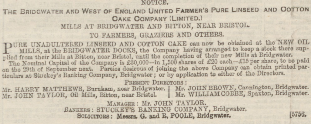 The company first traded under the name ‘the Bridgwater and West of England Farmers’ Pure Linseed and Cotton Cake Company Ltd’, but was later renamed as the ‘Bridgwater Oil Mills Ltd’. They were still trading under the old name as late as 1886. Either way, the company went into voluntary liquidation in 1891, with all debts and liabilities being paid off (Shepton Mallet Journal, 14 May 1886; Commercial Gazette (London), 7 January 1891; Weston Daily Press, 21 March 1914).