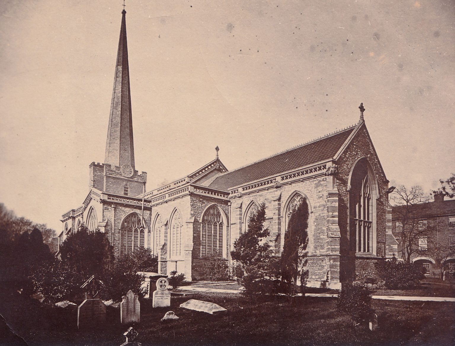 Immediately beyond the market house stands the parish church, dedicated to St Mary, a large and effective structure, with a tall and slender spire springing from a low square tower of red sandstone. The churchyard gates are kept jealously locked, but public footways run all around the building and allow any one to minutely examine every part of the exterior. The restorers have been busily at work here, and a great deal of what meets the eye is new. The Decorated and Perpendicular styles are somewhat oddly jumbled up together. The east window is Perpendicular, and so are those on the south side of the chancel and south transept. Beyond those, the Decorated style prevails up to the tower. On the northern side of the church the order is reversed. The Perpendicular there prevails in the nave windows, and then in the north transept and north chancel gives place to Decorated.
