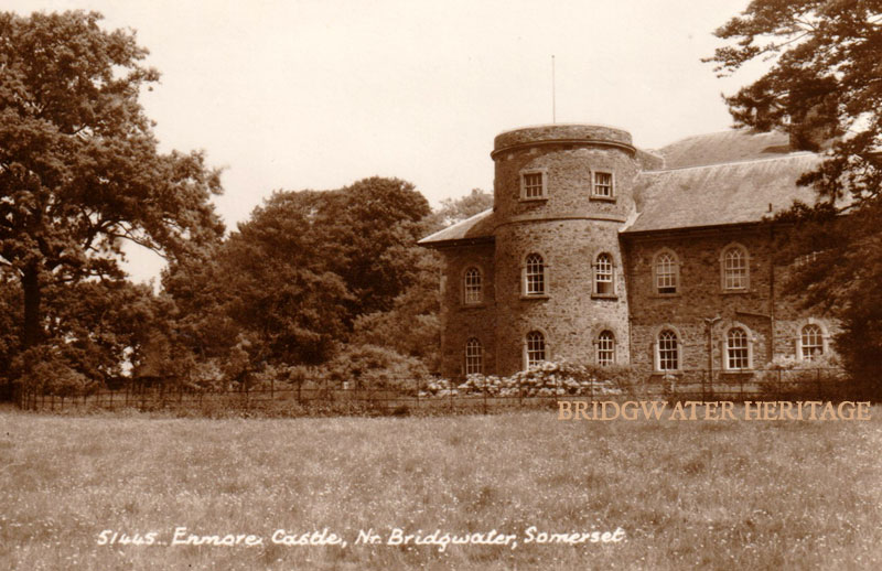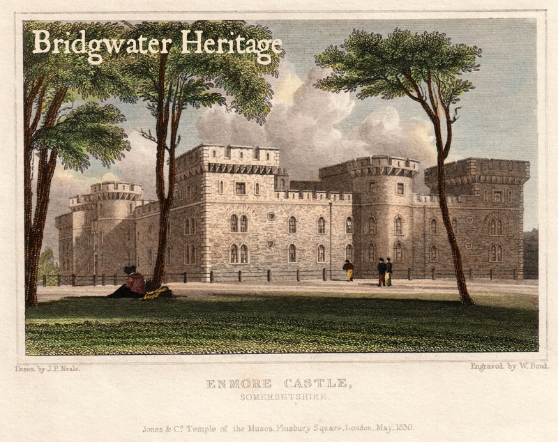 Enmore Castle, which in days of yore was inconveniently large, was purchased by Mr Broadmead two years ago, with its delightful domain, it has, by means of a clever architect, been re-constructed, and the Castle relieved of much of its unnecessary appendages – indeed it is so reduced in size, that a moderate-sized family may recreate there without the fear of being over-housed. George Robins proclaims it as the certain abode, at the approaching election, of the MP for Bridgwater or Taunton’.[11]