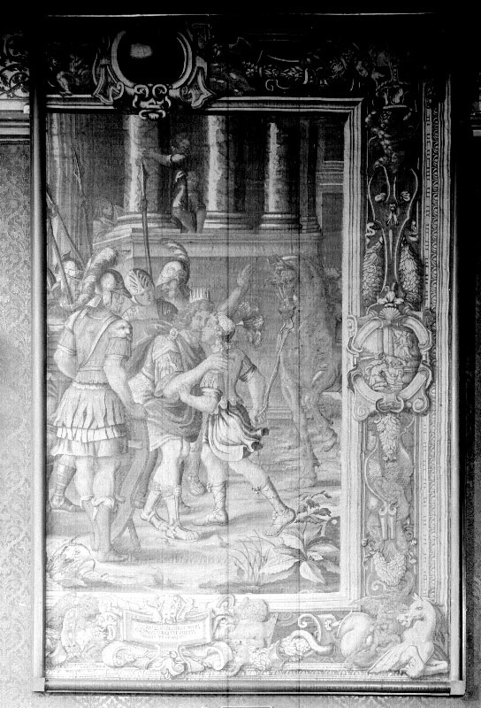 Philip wears a spiked crown, and is surrounded by a group of soldiers and other figures. The boy, advancing towards him, holds Bucephalus by the reins. The border is wide and showy: it has large sea-horses in the lower corners, a strapwork medallion in the centre of the side, and a blue cabochon at the top. The inscription is at the base in a long strapwork cartouche, flanked by cupids, and reads —